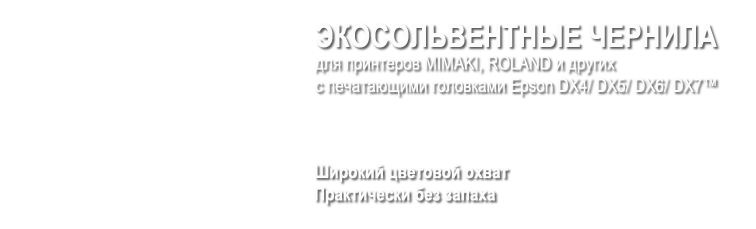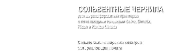 Äëÿ âàñ â íàøåì àññîðòèìåíòå ñîëüâåíòíûå, ýêîñîëüâåíòíûå, âîäíûå (ñóáëèìàöèîííûå) è ÓÔ-îòâåðæäàåìûå ÷åðíèëà äëÿ øèðîêîôîðìàòíîé èíòåðüåðíîé è íàðóæíîé ïå÷àòè ñ âûñîêèìè ïîêàçàòåëÿìè áåçîïàñíîñòè, îõâàòà è òî÷íîñòè öâåòîïåðåäà÷è, ñòîéêîñòè ê âûöâåòàíèþ äî äâóõ ëåò.